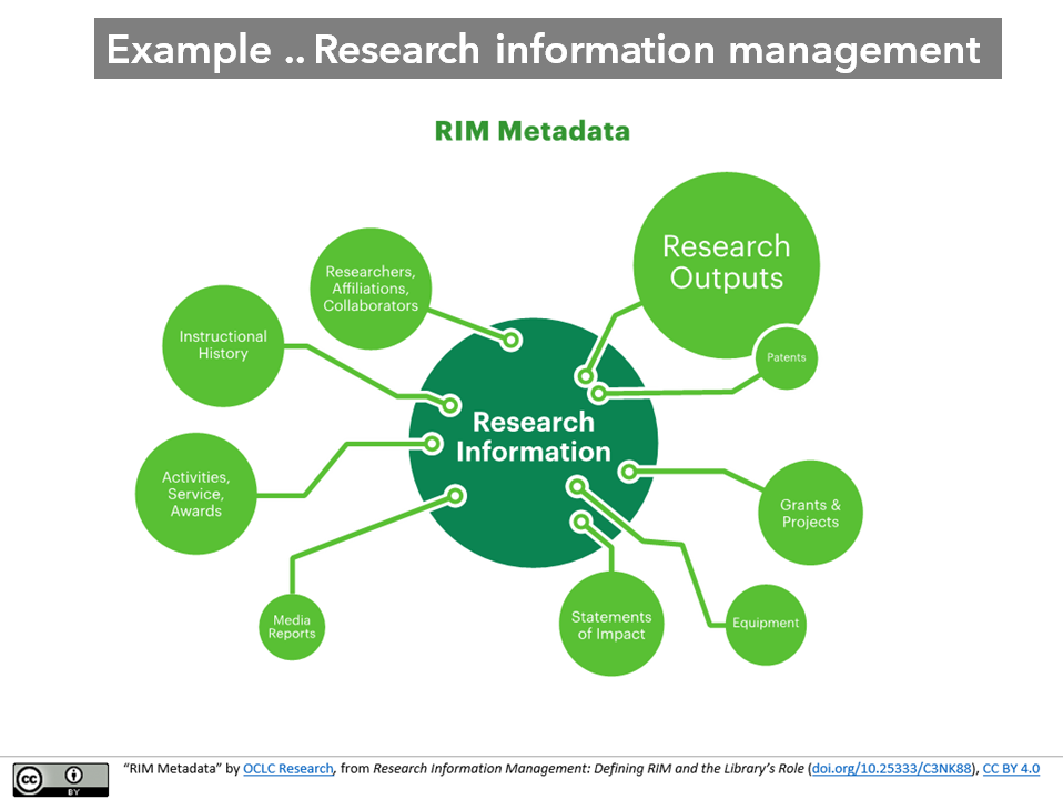 Research information management and the scholarly ecosystem provide a good example of this. This image shows a variety of entities of interest in a research information management system.