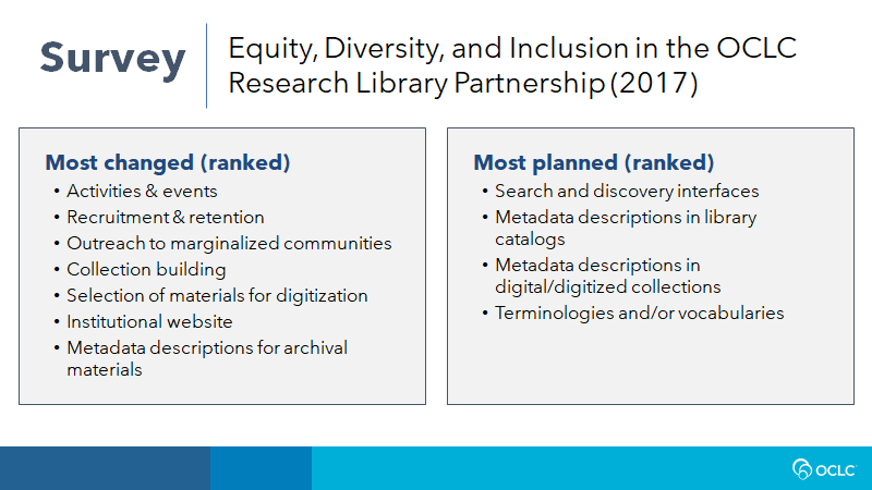 My Research Library Partnership colleagues carried out a survey on Equity, Diversity and Inclusion in 2017. While it is interesting to note the mention of archival description as among the most changed features, there was clearly a sense that metadata description and terminologies required attention, and there was an intention to address these next.