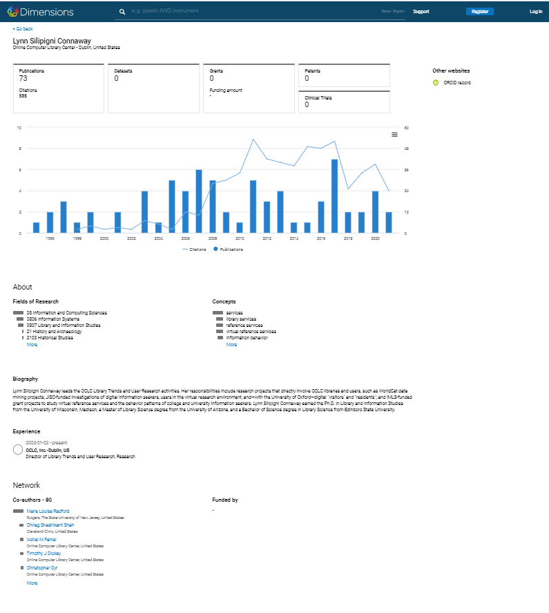 Here, for example, is a profile generated programmatically by Dimensions (from Digital Science) for my colleague Lynn Connaway. It aims to generate a description, but then also to recognize and link to other entities (e.g. topics, institutions, or collaborators). Again, the goal is to present a profile, and then to allow us to prospect a body of work and its connections. It pulls data from various places. We are accustomed to this more generally now with Knowledge Cards in Google (underpinned by Google's knowledge graph).