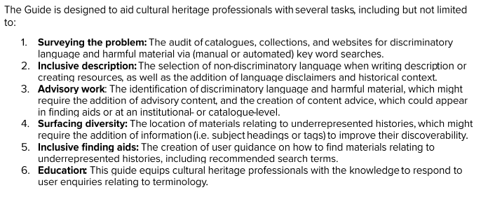 Many individual libraries, archives and other organizations are now taking steps to address these issues in their catalogs. The National Library of Scotland has produced an interesting Inclusive Terminology guide and glossary, which includes a list of areas of attention.