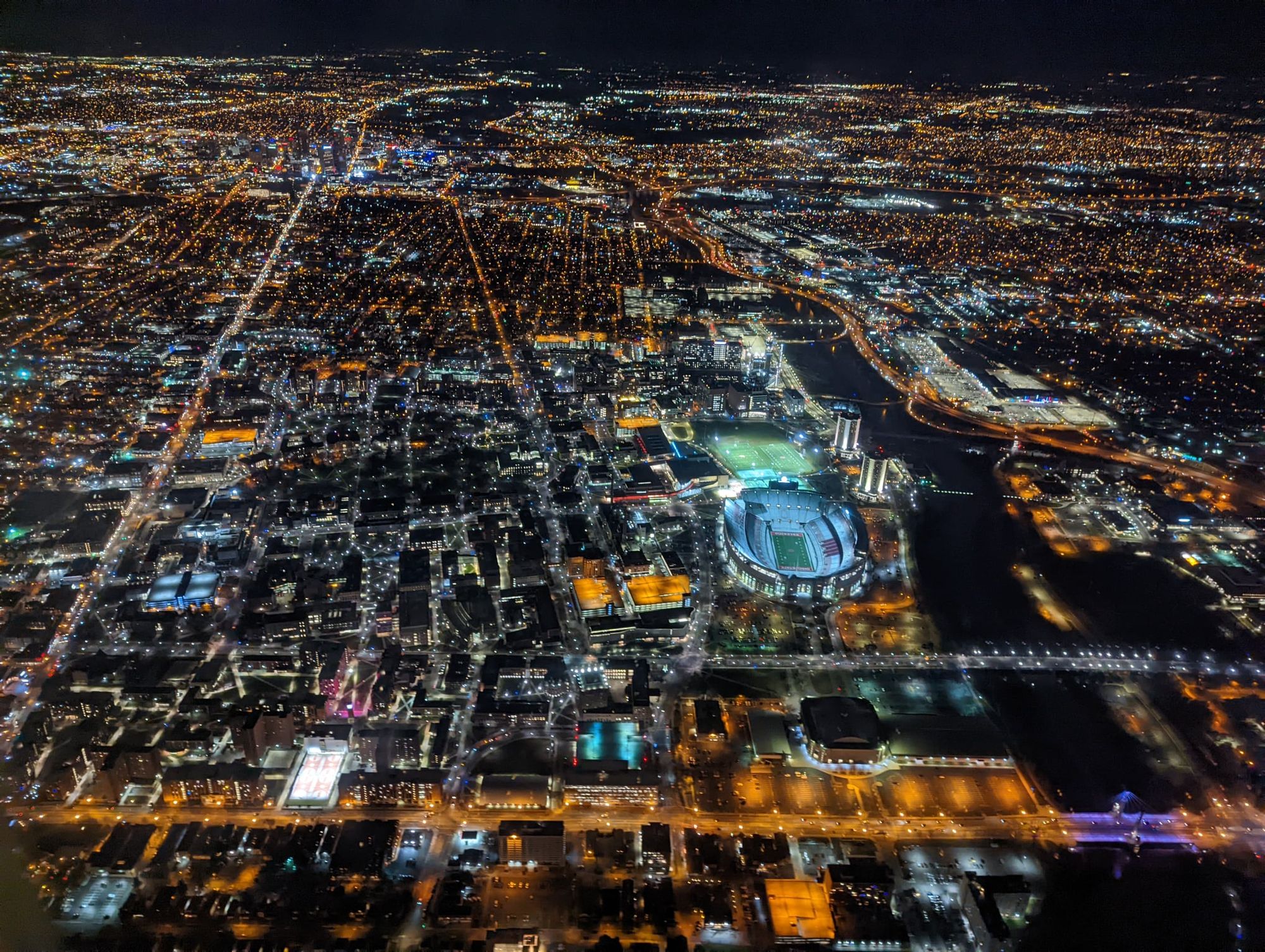 Columbus: Landmark Leveque Tower. Columbus from the sky, note the OSU football stadium, one of the biggest in the world. The Scioto River.