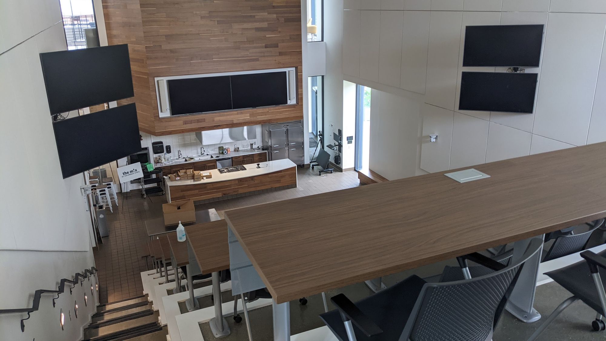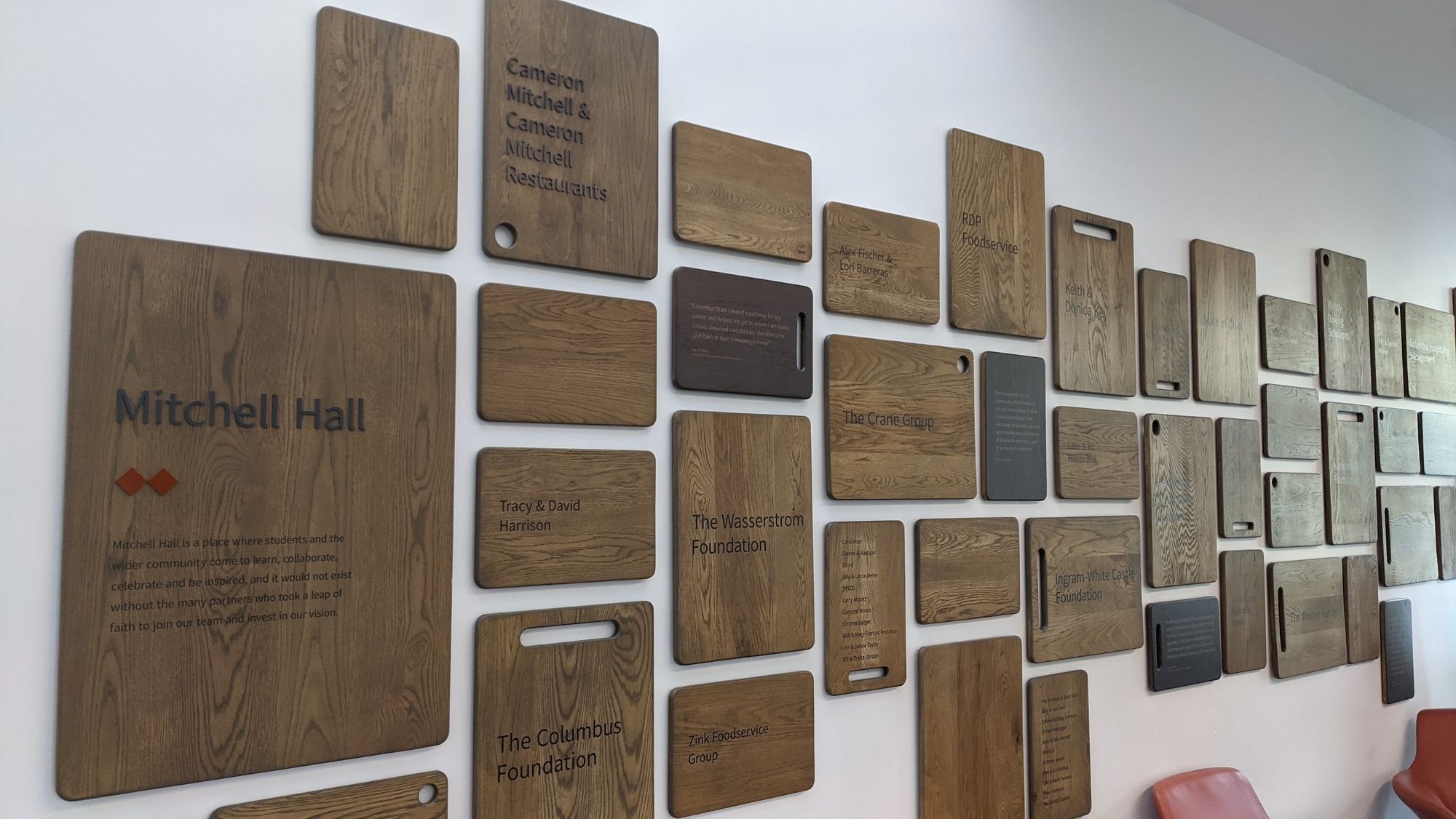 Mitchell Hall, Columbus State Community College, supported by Columbus restauranteur, Cameron Mitchell. Lecture theater with kitchen. 'Degrees' restaurant, a very nice training restaurant. And, a lovely touch, donor acknowledgements on chopping boards.