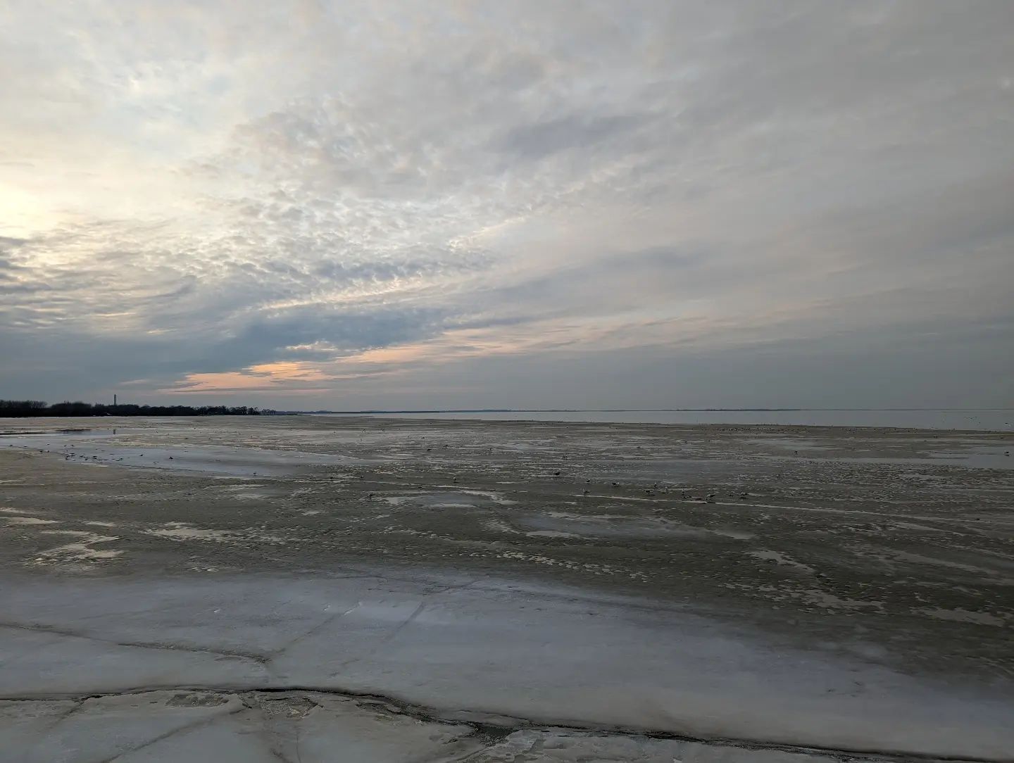Lake Erie: beach in Cleveland, frozen at Maumee State Park, looking out at downtown Cleveland.