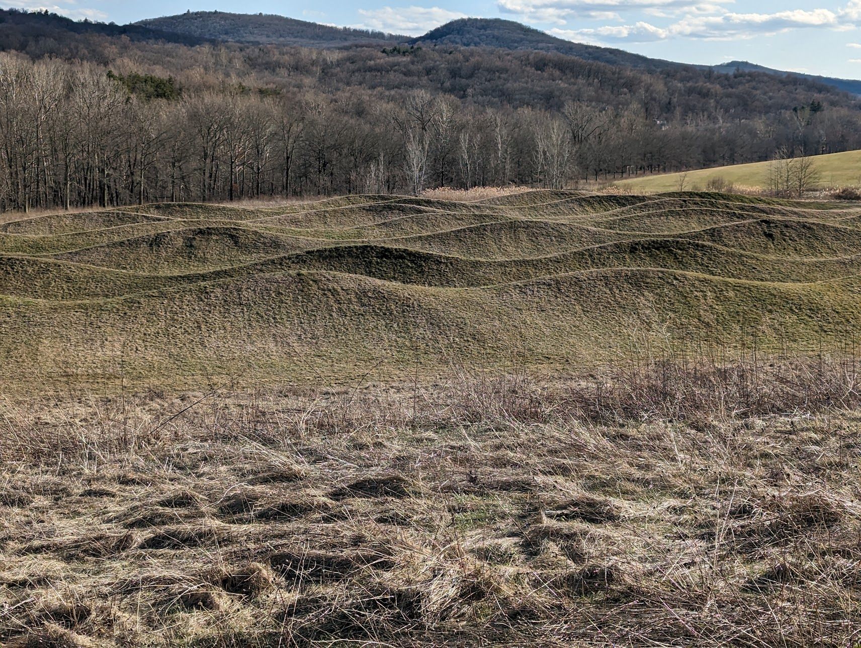 The artist and architect, Maya Lin, grew up in Athens, Southeast Ohio, where her parents were professors at Ohio University. She has acknowledged the influence of the burial mounds on her work, notably the Serpent Mound, and it is very evident in, for example, this massive work at the Storm King sculpture park in New York. This is one of three in a land art series created at different locations in the US.